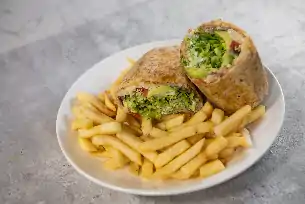 Avocado burrito with beans, cheese, sour cream, letucce and tomatoes