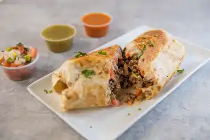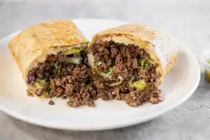 Ground beef burrito with beans, cheese, sour cream, letuce and tomatoes